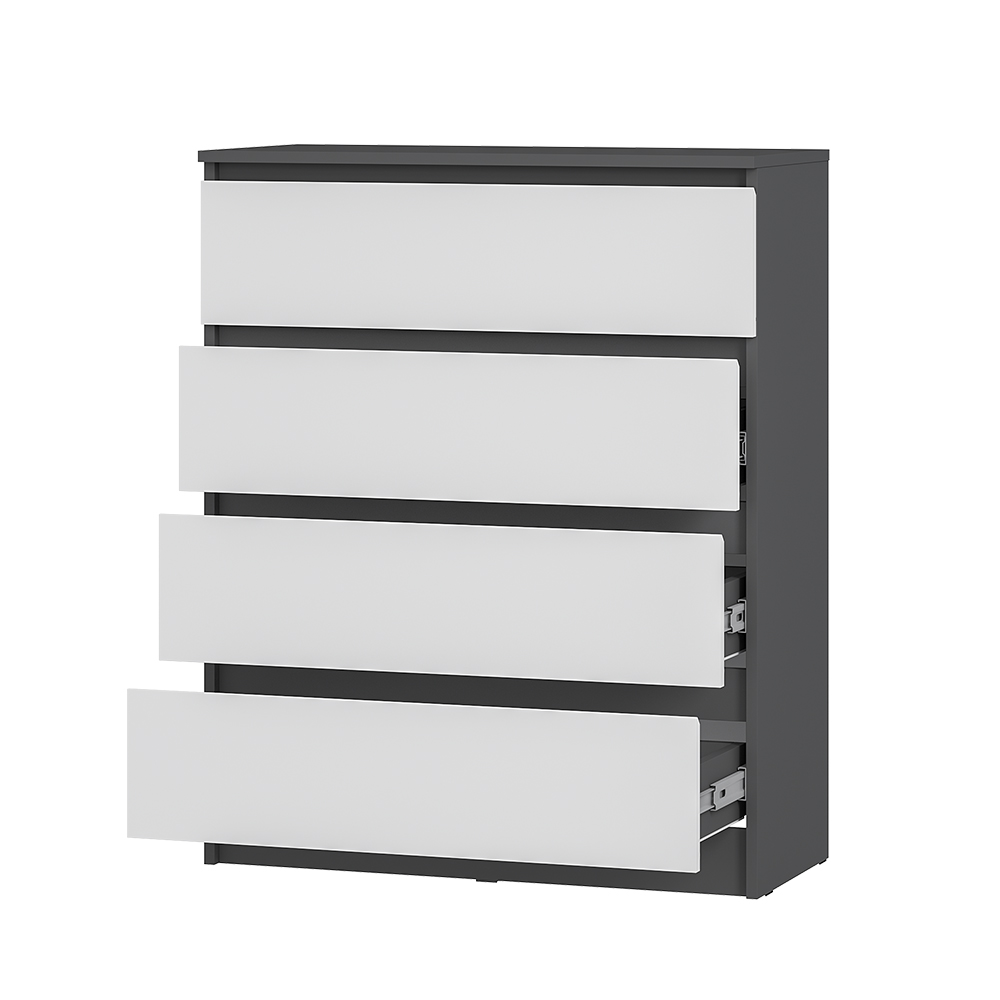 Коллекция "Шарм" - современная классика в контрастном исполнении "белый/графит". Комод воплощает чистый минимализм: гладкие фасады (без фурнитуры) и плавные шариковые направлящие.