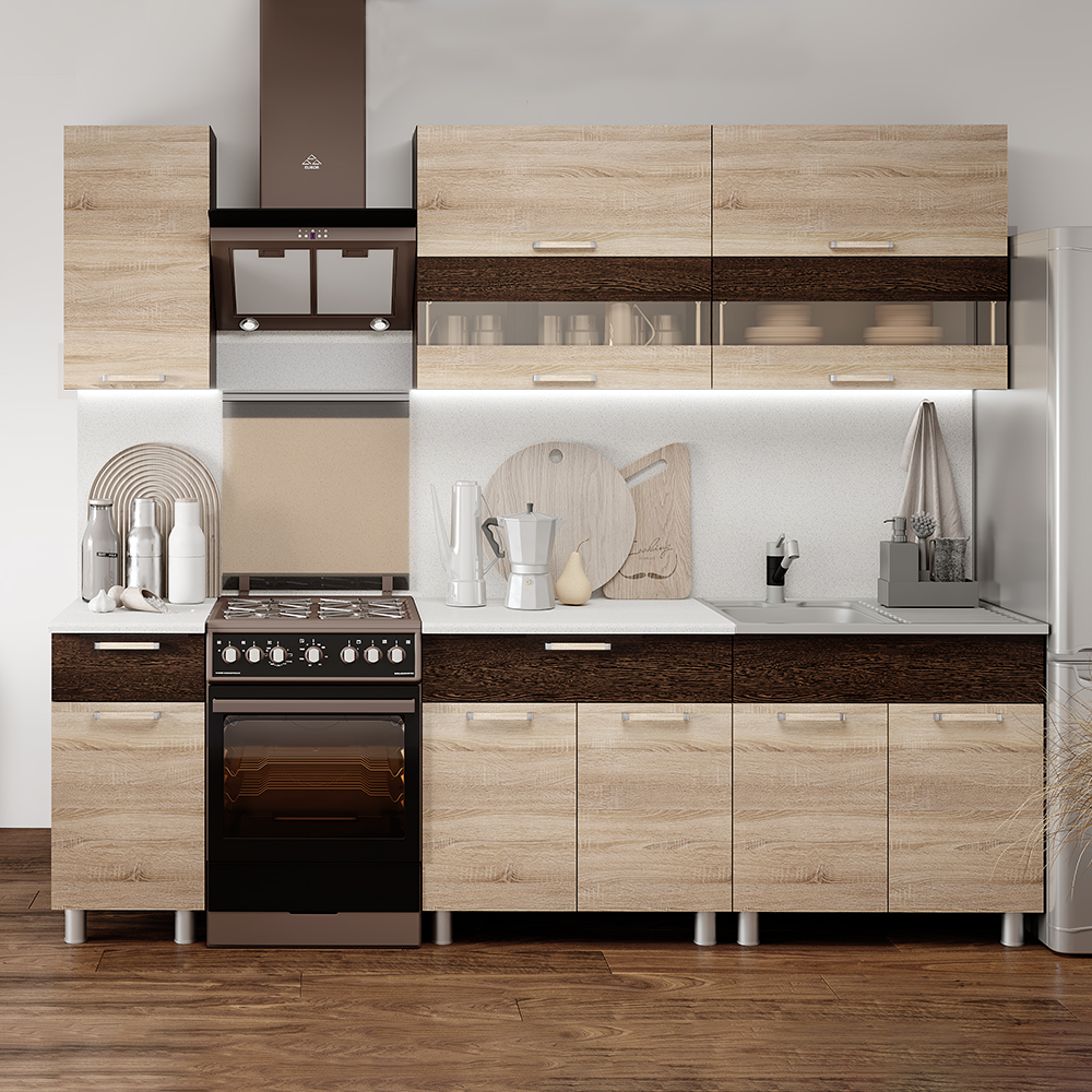 Кухня Монтана шириной 2м, включает в себя 2 нижних шкафа шириной 800мм, 1 нижний шкаф с ящиком - 400мм, 2 верхних шкафа со стеклом шириной 800мм, 1 верхний шкаф - 400мм.