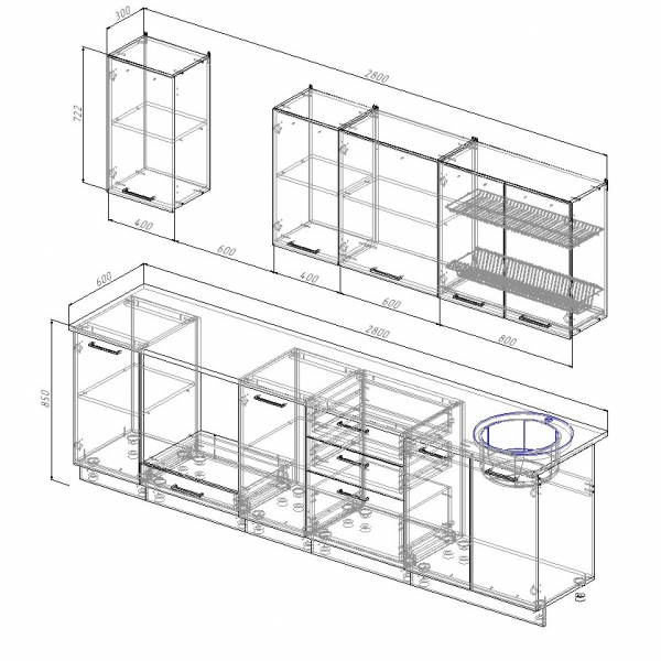 • Фасады со свесом – дают возможность использовать верхние модули без установки ручек, а также установить скрытую подсветку