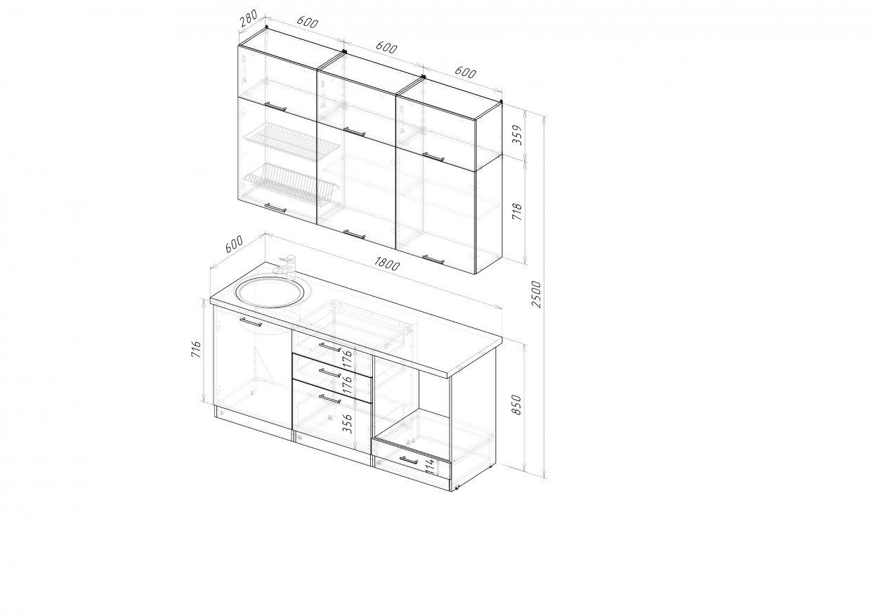 Ширина: 1800 мм; Глубина: 600 мм (со столешницей)
