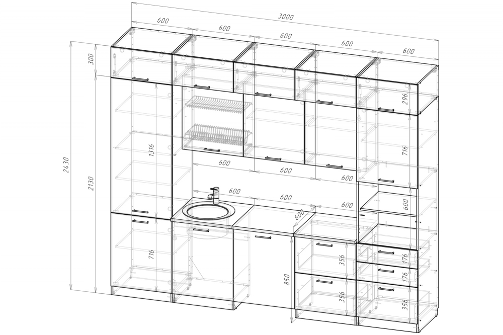 Ширина: 3000 мм; Глубина: 600 мм (со столешницей)