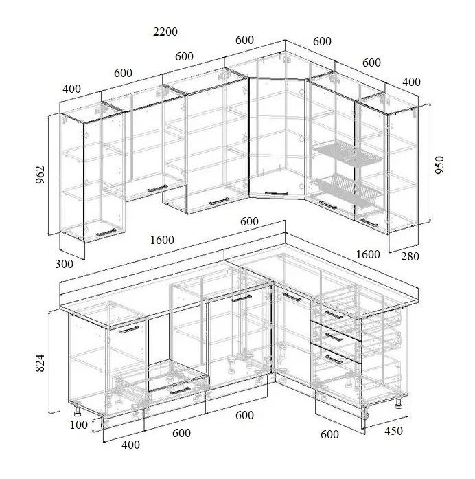 • Фасады со свесом – дают возможность использовать верхние модули без установки ручек, а также установить скрытую подсветку